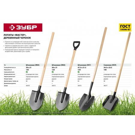 Штыковая лопата 285 х 205 х 1430 мм полотно 1.6 мм закалено дерев. черенок высш. сорт тип ЛКО ЗУБР Мастер 39570