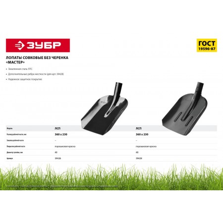 Совковая лопата 360 х 230 мм полотно 1.6 мм закалено с рёбрами жёсткости без черенка тип ЛСП ЗУБР Мастер 39428