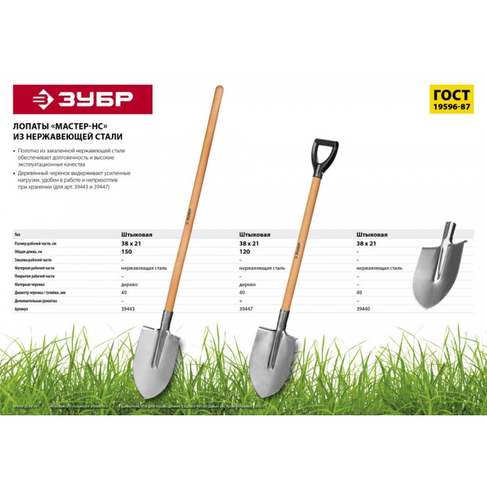 Штыковая лопата 380 х 208 х 1500 мм полотно 2 мм нержавеющая сталь закалено дерев. лакир. черенок высш. сорт тип ЛКО ЗУБР Мастер-НС 39443