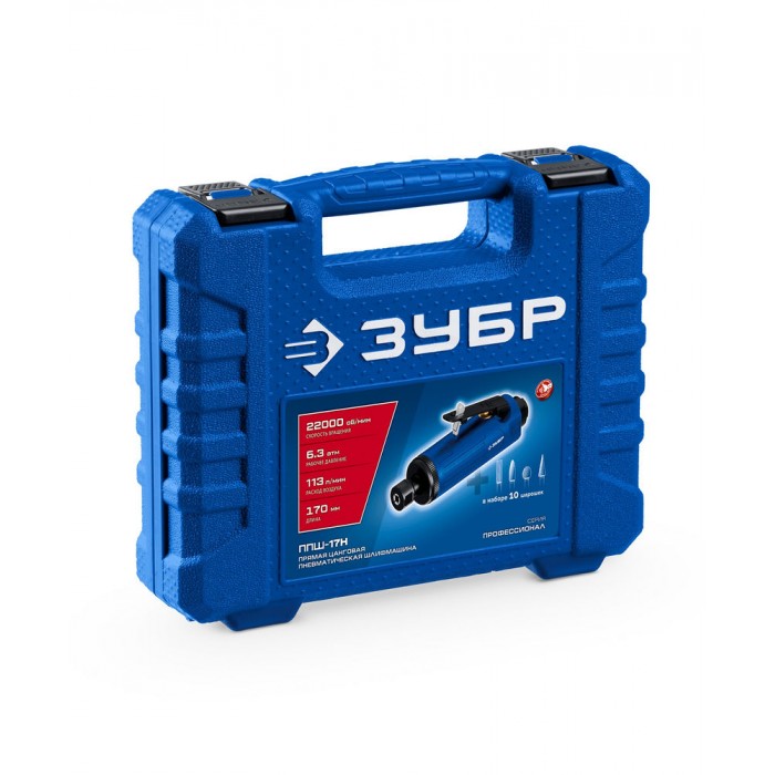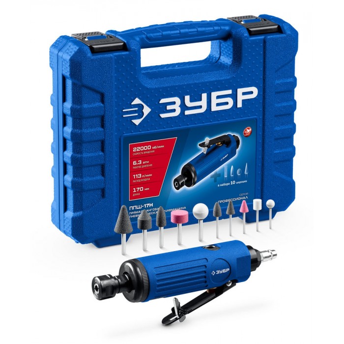 Набор в кейсе: прямая цанговая пневмошлифмашина, 10 шарошек и оснастка ЗУБР ПРОФЕССИОНАЛ 64333-H