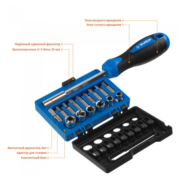 Компактная универсальная отвертка-битодержатель с набором бит и головок. Выдерживают высокие нагрузки благодаря высококачественной хромомолибденовой стали, закаленной по особой технологии.