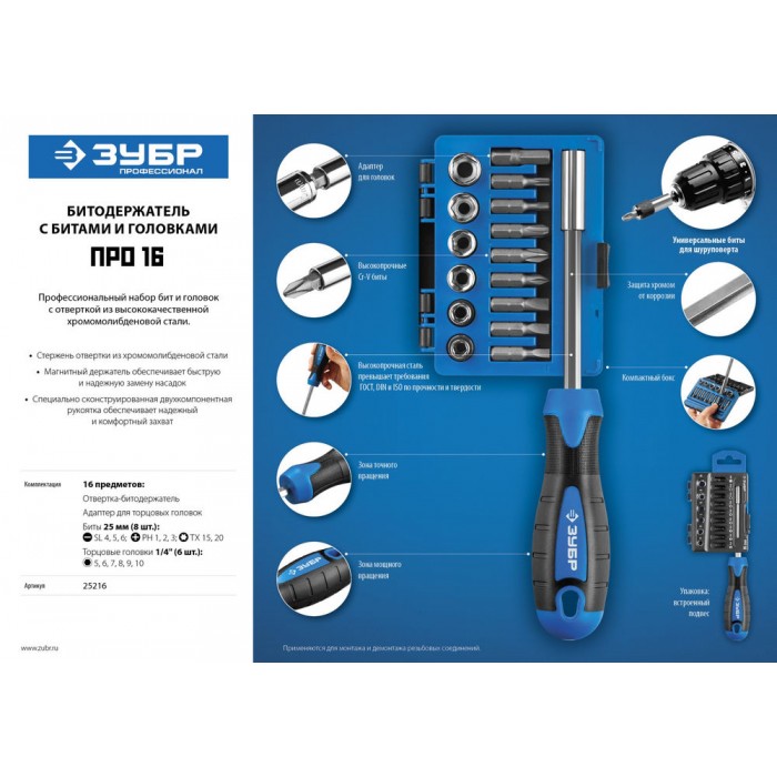 Отвертка-битодержатель с насадками Профессионал ЗУБР 25216