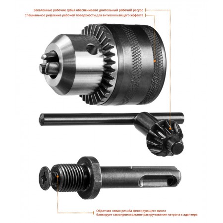 Набор применяется для зажима сверл, буров, концевых фрез и другого режущего инструмента с цилиндрическим, трёх- и шестигранным хвостовиком во всех типах ударных электрических и аккумуляторных, а также лёгких перфораторах с системой крепления ″SDS+″
