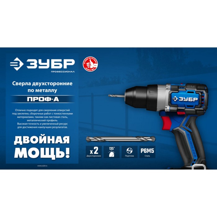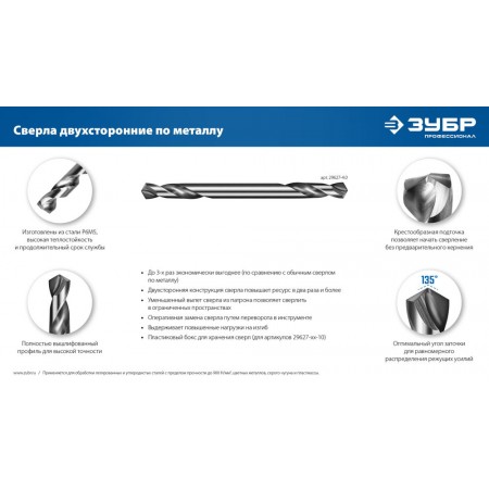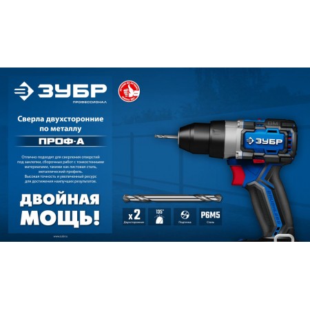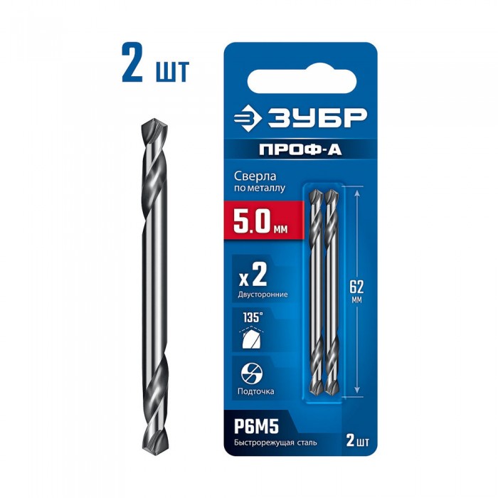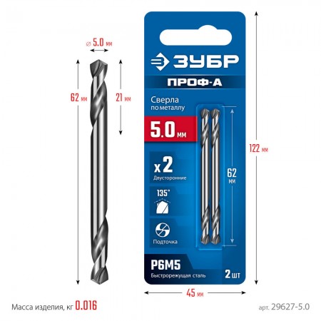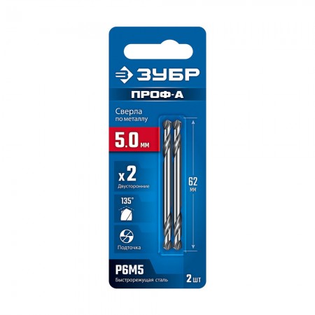 Сверло двухстороннее по металлу 5.0 х 62 мм, сталь Р6М5, класс А ЗУБР Профессионал 29627-5.0