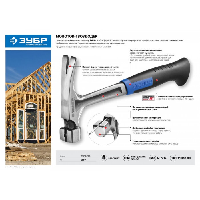 Цельнокованый столярный молоток-гвоздодёр 560 г ЗУБР Профессионал 20258-580