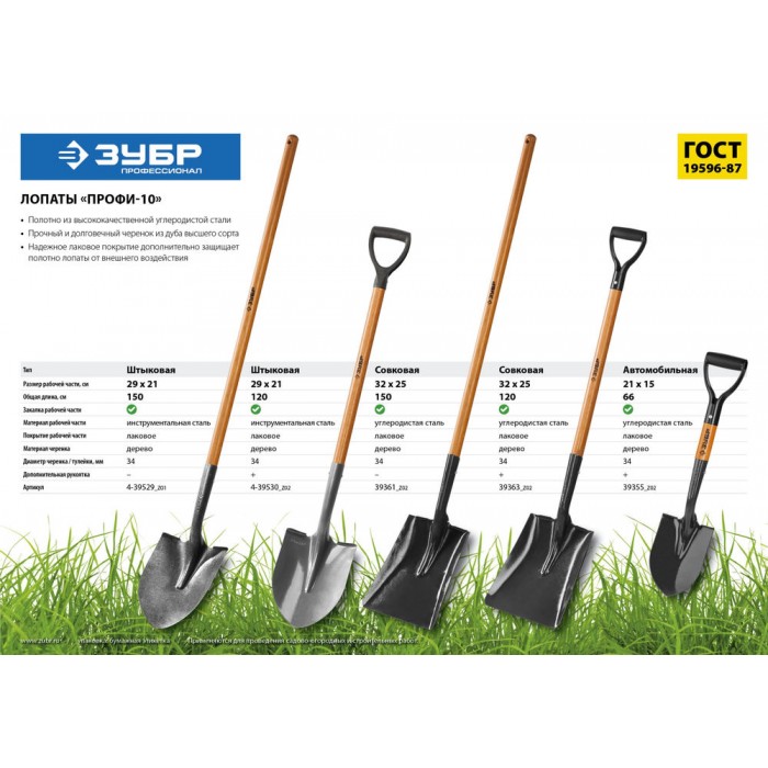 Штыковая лопата тип ЛСГ 290 х 210 х 1500 мм полотно 1.7 мм закалено черенок из дуба высш. сорта Профессионал ЗУБР Профи-10 4-39529