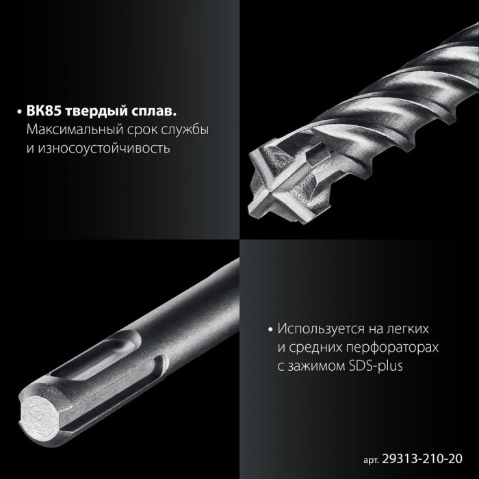 - Геометрическая форма наконечника с 4 кромками предотвращает заедание и поломку, обеспечивая эффективное сверление даже железобетона.