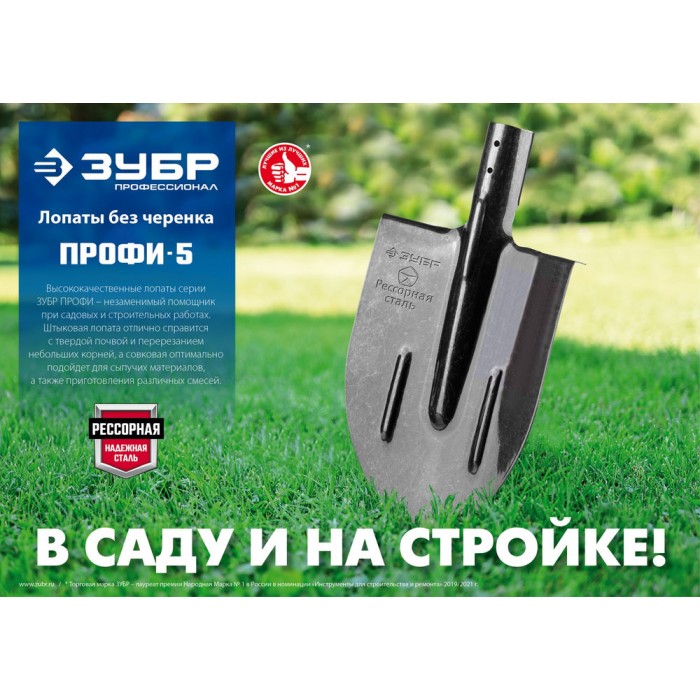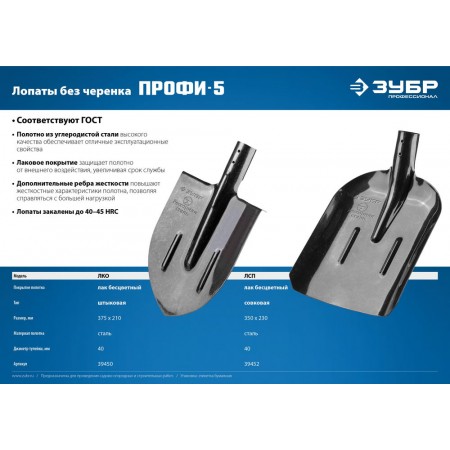 Совковая лопата тип ЛСП 350 х 230 мм полотно рессорная сталь 1.6 мм закалено с ребрами жесткости без черенка Профессионал ЗУБР ПРОФИ-5 39452