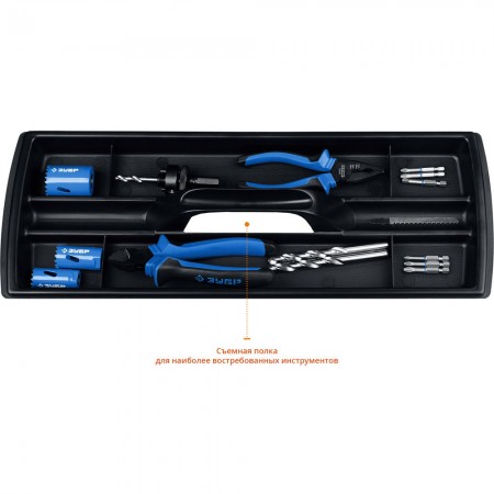 Прочный металлический ящик позволяет организвовать удобное и надежное хранение большого количества инструментов. Широкая алюминиевая рукоятка помогает сместить центр тяжести ящика если это необходимо