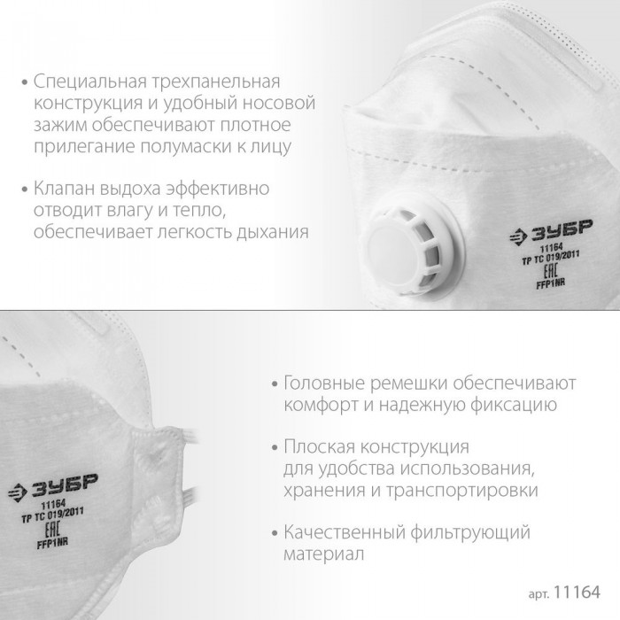 - Малая масса и возможность складываться делают полумаску удобной при использовании, хранении и транспортировке