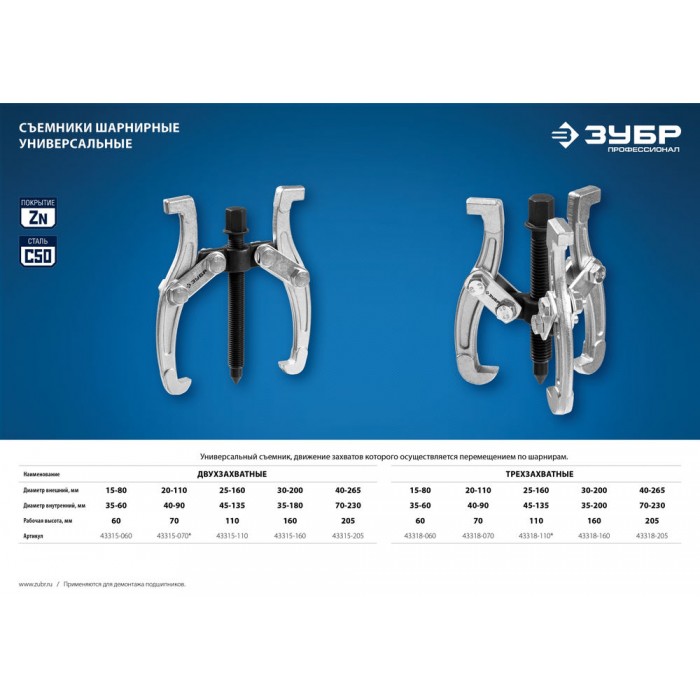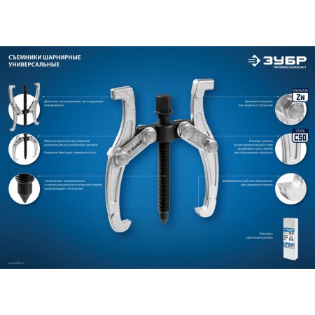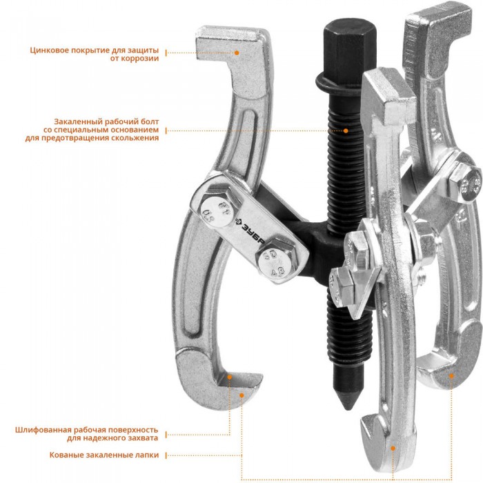 Захваты съемника выкованы из качественной инструментальной стали, что обеспечивает долгий срок службы при работе с высокими нагрузками. Позволяет работать с широким рядом узлов