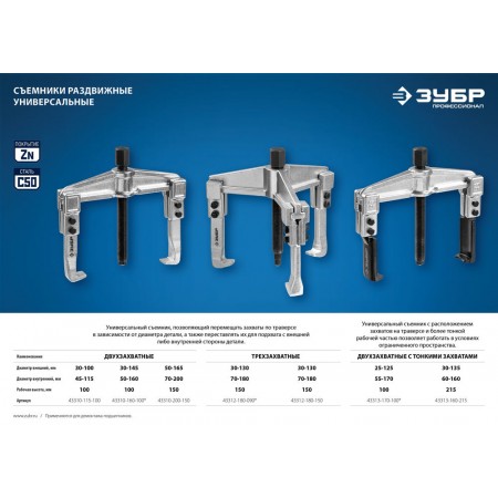 Съемник внешний d 30 - 130 мм внутренний d 70 - 180 мм раздвижной трехзахватный Профессионал ЗУБР 43312-180-150