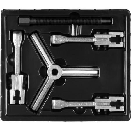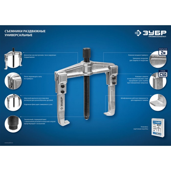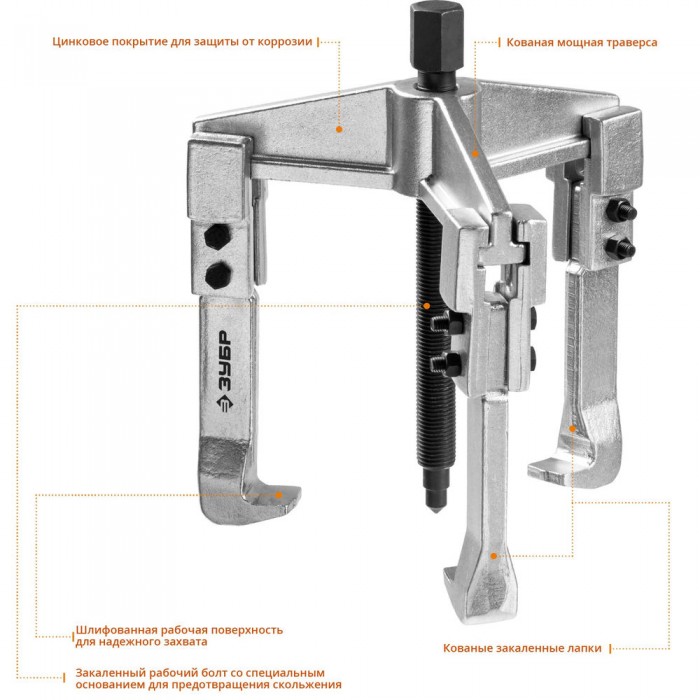 Захваты съемника выкованы из качественной инструментальной стали, что обеспечивает долгий срок службы при работе с высокими нагрузками. Позволяет работать с широким рядом узлов