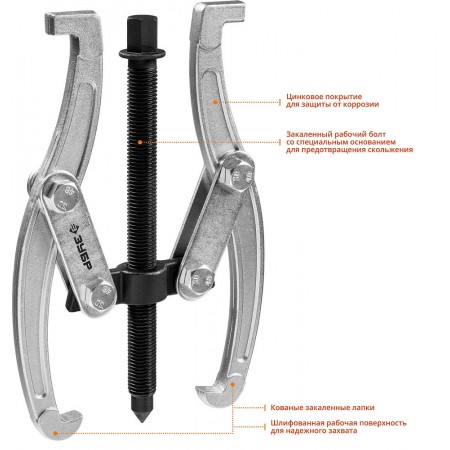 Захваты съемника выкованы из качественной инструментальной стали, что обеспечивает долгий срок службы при работе с высокими нагрузками. Позволяет работать с широким рядом узлов