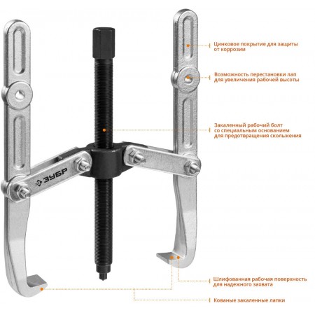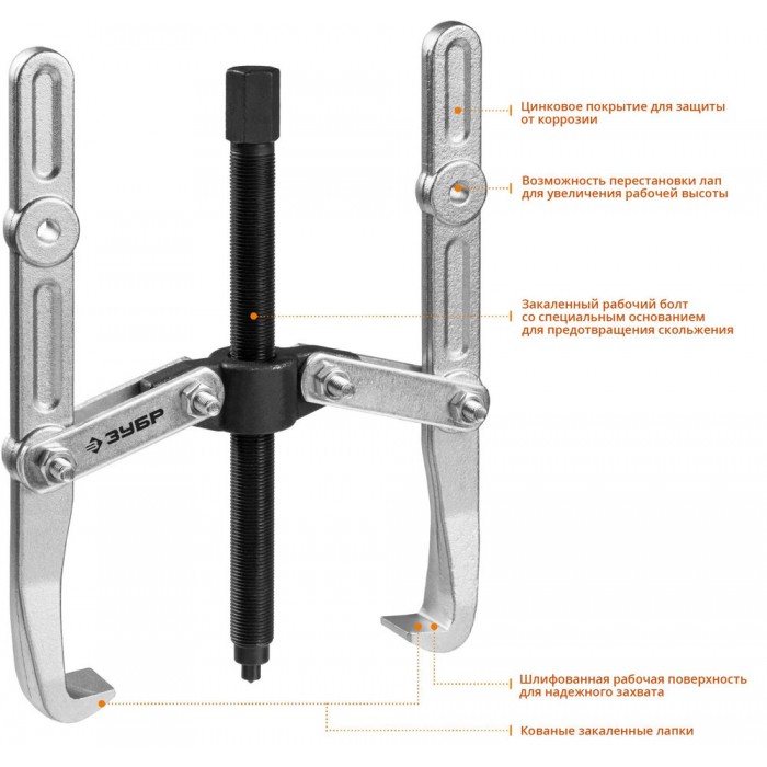 Захваты съемника выкованы из качественной инструментальной стали, что обеспечивает долгий срок службы при работе с высокими нагрузками. Позволяет работать с широким рядом узлов