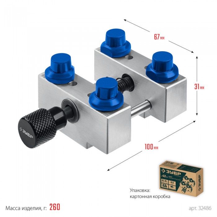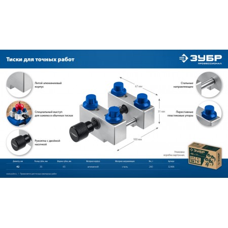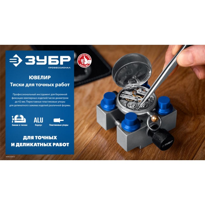 Профессиональные тиски ЗУБР ЮВЕЛИР для точных работ. Идеальный инструмент для бережной фиксации ювелирных изделий диаметром до 42 мм. Переставные пластиковые упоры позволяют зажимать изделия различной формы. Зажим деталей пралельными губками без использования упоров. Литой алюминиевый корпус. Специальный выступ на основании для зажима в обычных тисках. Зажимной винт и направляющие из качественной стали для точного хода. Двойная насечка на ручке для максимального удобства.
