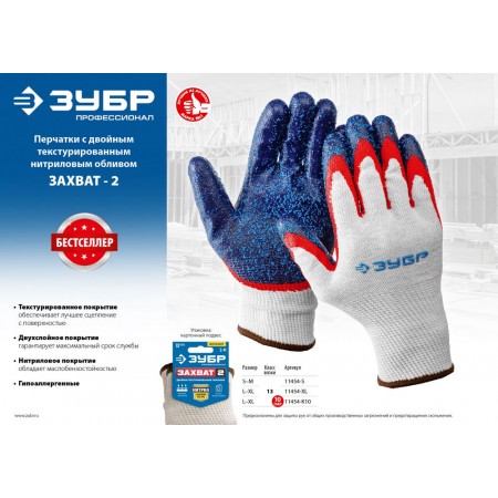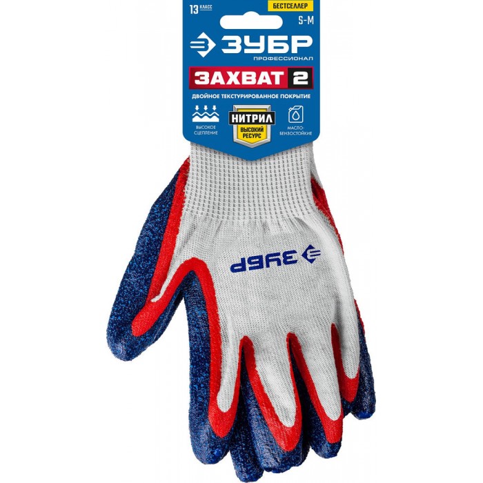 Перчатки х/б ЗАХВАТ-2 S-M с двойным текстурированным нитриловым обливом, повышенная износостойкость, 13 класс ЗУБР Профессионал 11454-S