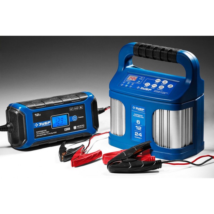 Интеллектуальное зарядное устройство предназначено для зарядки аккумуляторных батарей легковых и грузовых автомобилей, мотоциклов, снегоходов, катеров (лодок), газонокосилок, тракторов, гидроциклов и т.д. Зарядные устройства ЗУБР управляются с помощью микропроцессора. Данные устройства обладают высокой эффективностью и имеют защиту от ошибок, которые может допустить пользователь. Микропроцессор зарядного устройства оценивает состояние батареи и соответствующим образом устанавливает силу зарядного тока и напряжение (в зависимости от типа АКБ и её состояния). Это позволяет наиболее эффективно зарядить аккумулятор и продлить срок его службы.